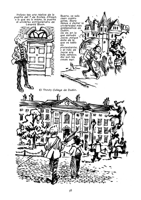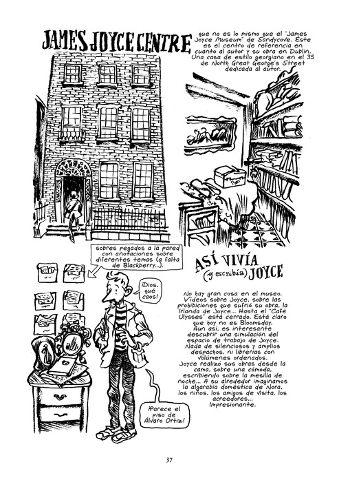 Así, asistimos a las más diversas peripecias que le llevaron a Zapico por Dublín, Trieste, París y Zúrich –las cuatro ciudades más importantes en la vida de Joyce–. En esas cuatro etapas de la ruta tras los pasos del escritor del Ulises, se intercalan otros tantos episodios “más cortos, pero importantes en la estructura y la gestación del proyecto”, precisa Alfonso Zapico, que le llevan a la localidad francesa de Angoulême, donde se realizó buena parte de la novela gráfica.