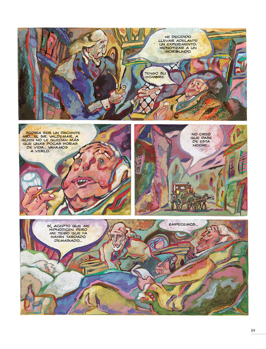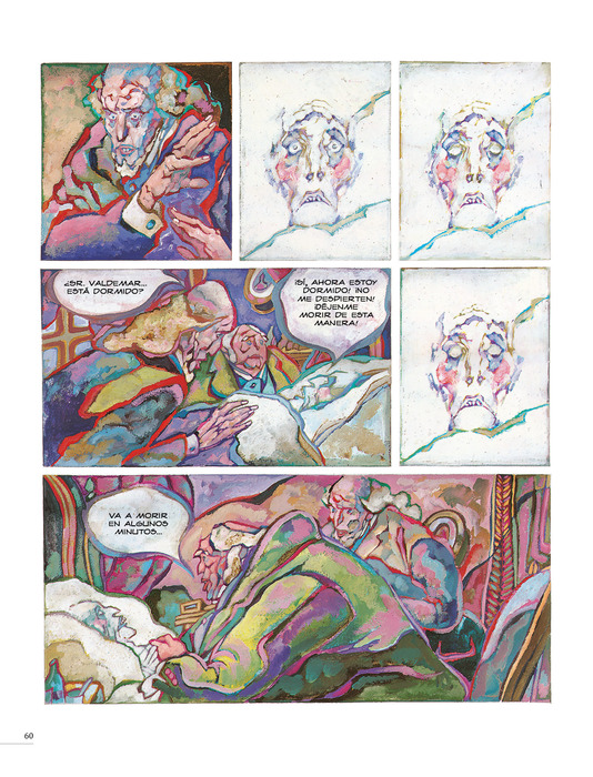 “Breccia talla el texto original, lo analiza y lo condensa para mantener solo unas pocas palabras. En sus adaptaciones literarias, el texto se borra frente al nuevo medio para dejar el campo abierto a la creación. Negros y blancos o una orgía expresionista de colores, cuerpos grotescos deformes o estilizados, Alberto Breccia adapta sus técnicas e investigación formal al ambiente de cada historia"