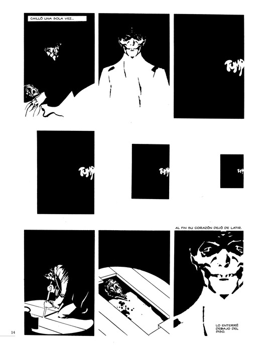 Realizadas en diferentes períodos, las cinco adaptaciones de cuentos de Edgar Allan Poe de Alberto Breccia reunidas en El corazón delator no son meros pretextos para una serie de variaciones estilísticas. Proporcionan al genio, firmemente convencido de que es el estilo el que debe adaptarse a la atmósfera de la historia, y no al revés, una nueva oportunidad para mostrar su dominio excepcional del dibujo y la composición. Con una desenvoltura y una facilidad asombrosas, pasa de un minimalismo formal y un montaje cinematográficos (“El corazón delator”) a los tonos grotescos (“William Wilson”) o a un estilo más expresionista (“La verdad sobre el caso del señor Valdemar”). Si una distancia clara separa el rigor despojado que usa en “El corazón delator” de la profusión de formas y colores que explota en “La máscara de la Muerte Roja”, sin embargo, un hilo rojo conecta todas estas historias. La constante invención gráfica que demuestra Breccia tiene por única intención iluminar de una forma cruda la borrosa línea entre la vida y la muerte. De este modo, captura este momento decisivo cuando, agarrado por la nada, el hombre se convierte en su propio verdugo, esa falla insondable que el propio Poe nunca ha dejado de explorar a lo largo de su trabajo.