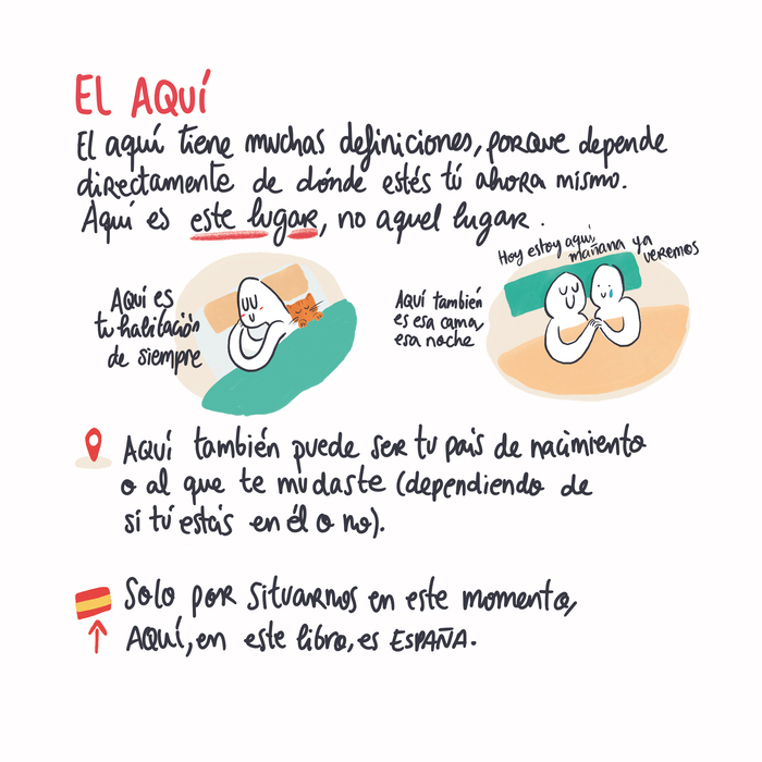 Gente de aquí, gente de allí es un libro reversible que se puede empezar a leer por cualquiera de sus dos lados: “Gente de aquí” y “Gente de allí”, que inevitablemente se juntarán en el centro. Una forma divertida de contar realidades diferentes.