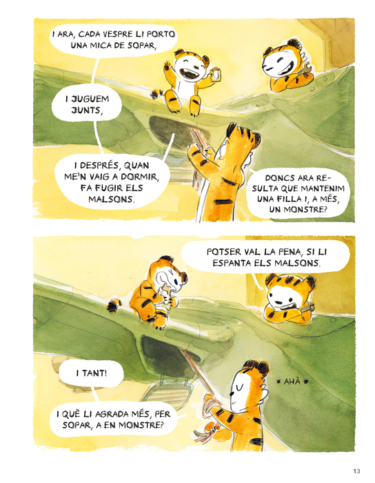 La Tigre té molta sort: un monstre viu sota el seu llit. Cada nit, la Tigre i en Monstre juguen junts fins que és hora d’apagar el llum. Per descomptat, en Monstre no espantaria mai la Tigre; un bon amic no ho faria mai, això. Però en Monstre ha d’espantar algú: al cap i a la fi, és un monstre. Així que mentre la Tigre dorm, en Monstre li espanta tots els malsons. Gràcies al seu amic, la Tigre només té somnis agradables. Però un dia, en fer-se fosc, els espera un malson tan gran i tan dolent, que en Monstre tot sol no el pot fer fora. Només el treball en equip i molt de coratge poden fer-lo desaparèixer.