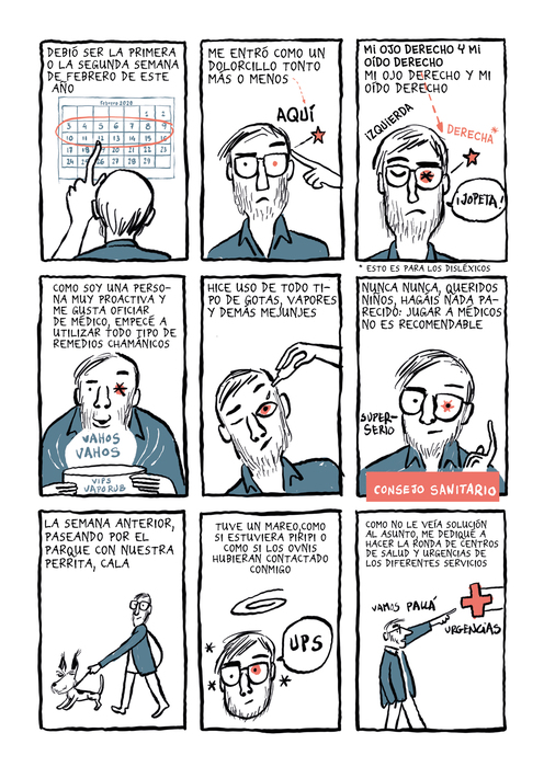 Miguel Gallardo percibe a principios del año 2020 que se encuentra algo cansado por la sucesión de viajes y talleres que, año tras año, realiza de manera recurrente desde la publicación en 2007 de su éxito creativo María y yo, una novela gráfica en la que cuenta su relación con su hija, que tiene autismo. Siente el autor catalán que es el momento de tomarse al menos un mes sabático. Sin embargo, aquejado de un pequeño dolor, entra por la puerta del hospital y acaban extirpándole un tumor de cuatro centímetros de una cabeza que queda marcada por cuarenta y cinco grapas “y un pelo a lo punk”, un poco como Makoki, uno de los célebres personajes que Gallardo cocreó como dibujante a finales de los años 70.