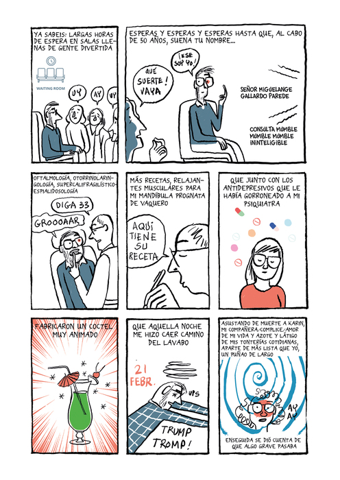 Y sale además del hospital para seguir tratándose del proceso cancerígeno en un mundo sumergido en una pandemia que poco o nada se parece al que había cuando entró por su propio pie a mirarse ese “dolorcillo” que le acompañaba en su vida cotidiana. Algo extraño me pasó camino de casa, coeditado por Z como SanZ, un proyecto de edición en el que puso mucho de sí mismo el desgraciadamente fallecido Julián Sanz, es la necesidad de Miguel Gallardo de dibujarlo y explicarlo todo, primero para entenderlo él mismo y después para contarles a los demás “lo que es viajar a la luna sin casco y luego volver sin mapas ni guías... Pero sin melodramas, ¿eh? Esta es –asegura Gallardo–, una crónica de los hechos inexplicables personales y mundiales que acaecieron en el año del Señor de 2020”.