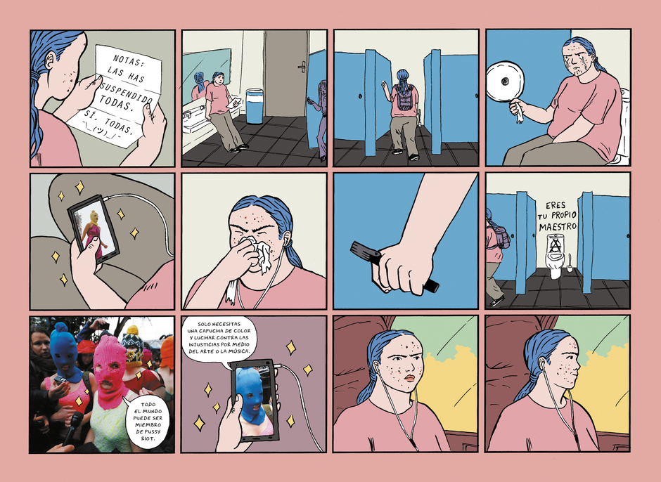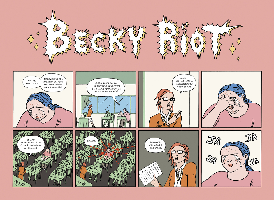 Becky is a lonely and insecure teenager. Her parents have just separated, and she keeps getting suspended and is bullied at school. After stumbling upon some videos of Pussy Riot, she decides to create a new identity, Becky Riot, liberating herself and rebelling against the system. A story full of black humor and bad moods, with a protagonist equal parts loser and charismatic, drawing on the comics of Daniel Clowes and Simon Hanselmann.