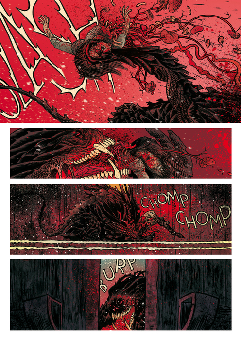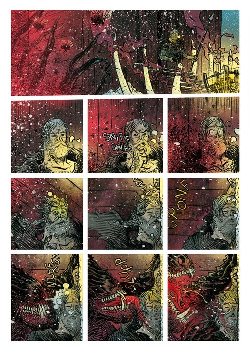García and Rubín’s version of of the myth of Beowulf faithfully follows the plot and three-act structure of the original text, a foundational work of English literature, and carries with all its power the epic and melancholic resonance of its verses through the formal conventions of contemporary comics.