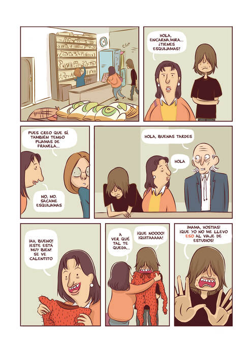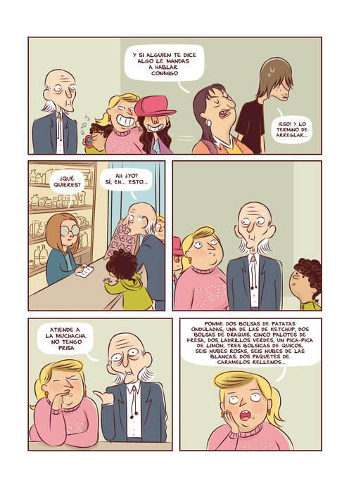 Clara Soriano lleva varios años publicando tiras e historias cortas casi exclusivamente en internet (Caniculadas, El estafador...), salvo excepciones (El Jueves). Ahora da el salto al papel con Colmado Sánchez, un trozo de universo en el que conviven chonis, abuelos, hipsters, familias-como-Dios-manda y solitarios incautos, en una mezcla tan poco coherente como la vida misma.