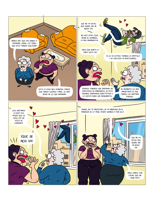 Dolores' peaceful and pleasant life is turned upside down when her granddaughter Lolo loses her job and has to come and live with her. Dolores, a widow who is stuck in her ways, is shocked to see how Lolo—bisexual, polyamorous, and vegan—revolutionizes her home. Through a profusion of secondary characters, Dolores and Lolo reflects, through shocks, guffaws, adventures, and quite a bit of sex, a singular universe, one that belongs to those who occupy the margins of our boring society. Party's Over, we reach the close of a series that has taken on social criticism, laughter, and debauchery with pride and enthusiasm.