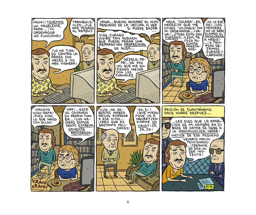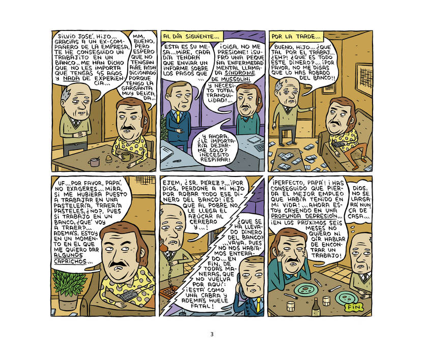 Tyrannical, crude, idle, maladjusted, grotesque, irascible… There is no lack of adjectives to describe Silvio José Pereda, a 45-year-old confirmed bachelor obsessed with WWII videogames, sausages, and Steven Seagal films—who occupies himself leeching off of his poor father’s old age. Influenced by authors such as Clowes, Blanquet, Doucet, and Bagge, Alcázar sketches out a ruthless portrait of our deranged society using his black sense of humor, cynicism, and above all hilarity.