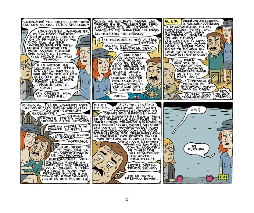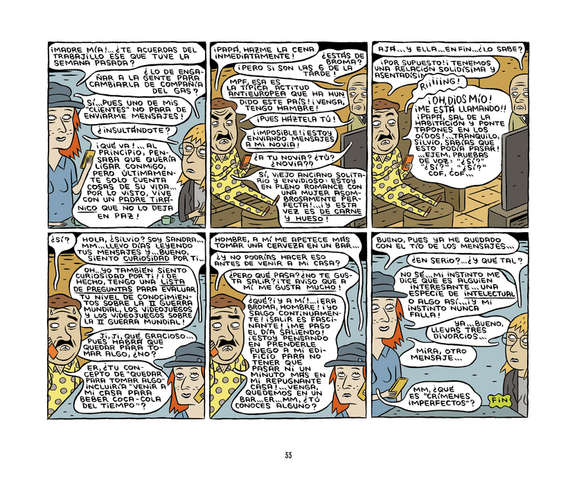 Tyrannical, crude, idle, maladjusted, grotesque, irascible… There is no lack of adjectives to describe Silvio José Pereda, a 45-year-old confirmed bachelor obsessed with WWII videogames, sausages, and Steven Seagal films—who occupies himself leeching off of his poor father’s old age. Influenced by authors such as Clowes, Blanquet, Doucet, and Bagge, Alcázar sketches out a ruthless portrait of our deranged society using his black sense of humor, cynicism, and above all hilarity.