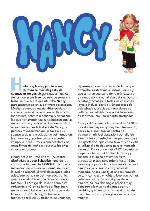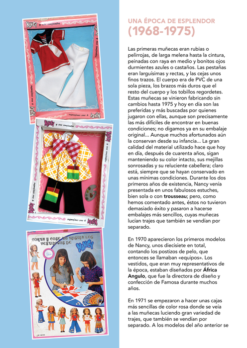 Toyland Made in Spain no pretende ser, a lo largo de sus 240 páginas, un estudio exhaustivo de la muñeca española de los 70 y de los 80, sino un cariñoso recuerdo a algunas de esas muñecas que poblaron la infancia de muchos. Por sus páginas desfilan clásicos como Barriguitas, Pin y Pon, Nenuco, Lesly...., pero tampoco se olvida de todas esas muñecas de marca desconocida, de mejor o peor calidad, de ferias y tómbolas, que hicieron felices a muchos niños, ni de las muñecas recortables, de los cuentos troquelados o de los cromos de picar.