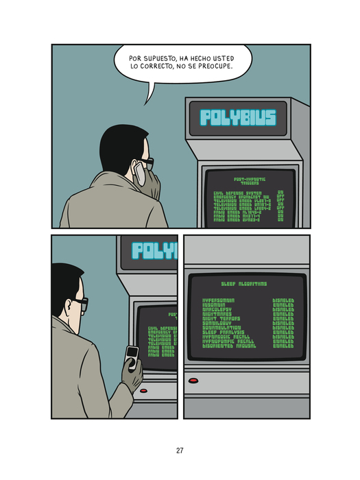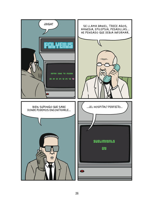 David Sánchez forma ahora parte de esta cadena de reinvención colectiva: en Videojuegos, el autor de No cambies nunca (Astiberri, 2012) se centra en la leyenda urbana de Polybius, aquella máquina recreativa psicodélica con efectos supuestamente devastadores en la mente de los jugadores, y manejada por unos extraños hombres vestidos de negro.