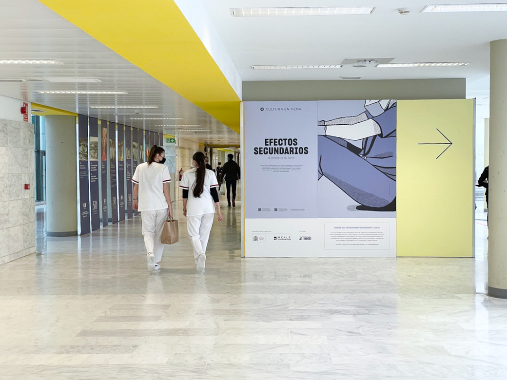 El libro colectivo Efectos secundarios. 19 historietas del covid protagonizará una exposición en el Hospital Puerta de Hierro de Madrid que se inaugura el lunes 25 de abril. La fundación Cultura En Vena, coeditora de la obra junto con Astiberri, organiza esta muestra en el el centro sanitario con el objetivo de acercar la cultura a los sitios donde no suele llegar y de mejorar el bienestar y la salud de los pacientes a través de la cultura.