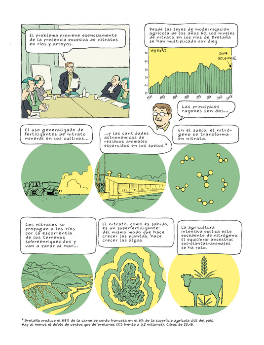 El equilibrio ancestral sol-plantas-animales se ha roto. El origen del desastre ecológico se encuentra principalmente en el nitrato, un superfertilizante que provoca la proliferación de las algas que generan toxicidad en las aguas y entornos naturales. En Bretaña, la agricultura y ganadería intensivas explican este excedente de nitrógeno; un problema que en España, con su propia idiosincrasia, tiene su terrible reflejo en el Mar Menor, en Murcia.