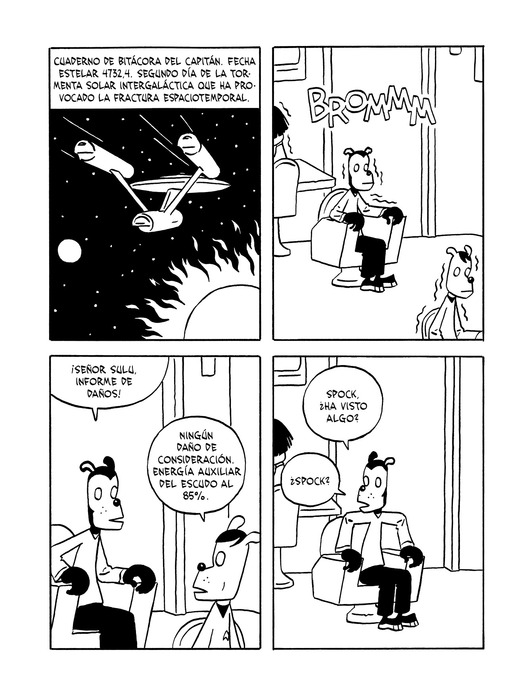 En Amanecer roto, los mundos confluyen, dan la vuelta y se mezclan en híbridos salvajes e improbables: Spock se convierte en Foujita, el prisionero número 6 visita a Kafka, las obras de Joyce y Tarantino se fusionan, Moisés se encuentra cara a cara con Alain Delon, Sartre se convierte en Travolta, y aparecen, sin ningún orden en particular, Perec (como detective privado), Athos, Frida Kahlo, Van Gogh, Sinatra, Lemmy, Zappa, Bukowski, en universos que se inspiran en Dostoievski, Ed Wood o EC Comics.