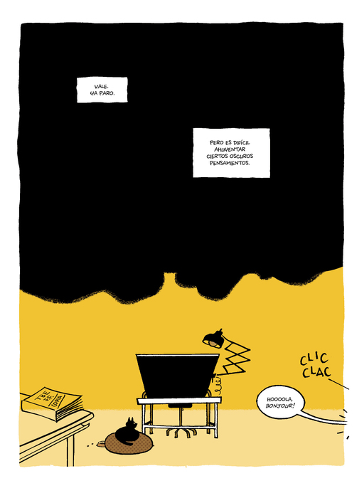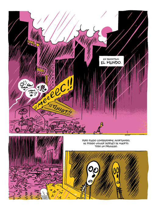 Antes del accidente había enviado el proyecto en PDF a siete editoriales pero ninguna le respondió, de manera que el cómic puede perderse para siempre si él no vuelve y lo recupera. La Muerte siente curiosidad y accede, lo deja volver solo para eso, con la condición de que le traiga las páginas para leerlas con ella. Ya en forma de esqueleto, el protagonista vuelve al mundo y se dirige a su estudio, que compartía con un compañero, y empieza a atar cabos... Un cómic en el que Pep Brocal se sirve de la estructura clásica de las historias de aventuras para reflexionar desde el humor sobre temas como la inspiración, la creación o la trascendencia, el papel del autor y del editor, así como de ciertos pecados del mundo editorial.