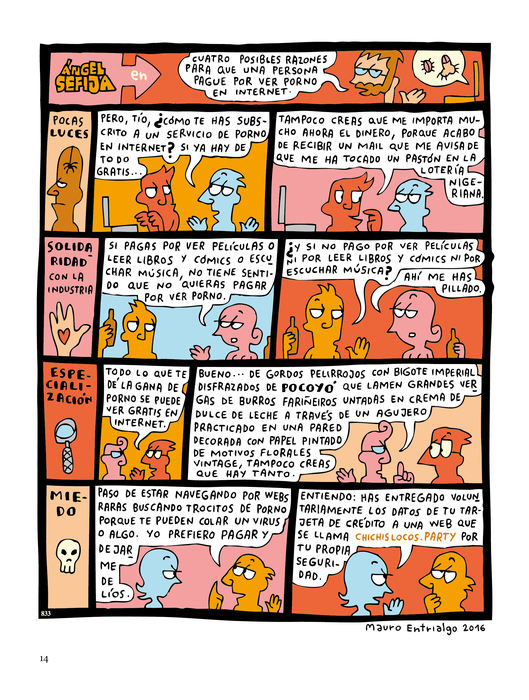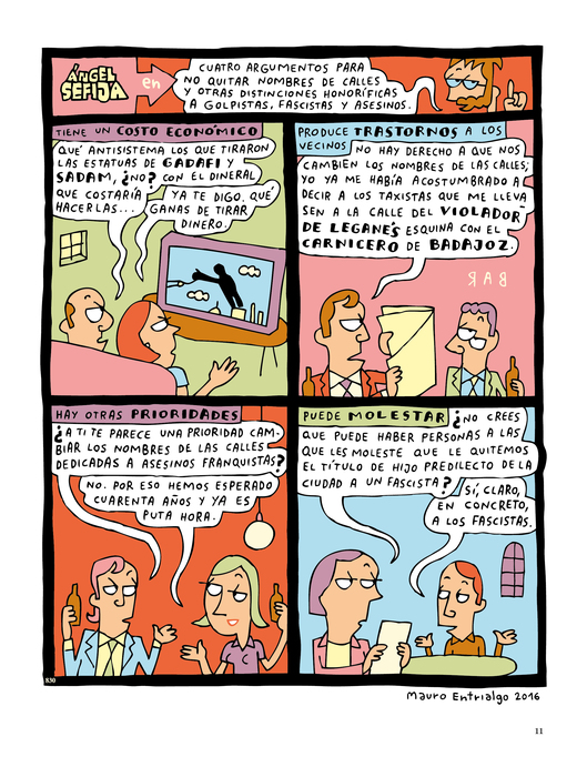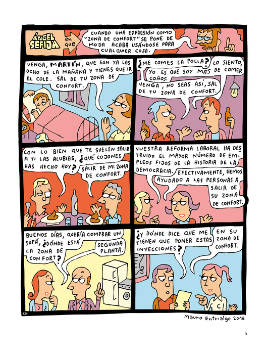 “Confieso que a veces –añade Cebrián en el prólogo de este tomo– me olvido de que Ángel Sefija es un personaje de ficción creado por Entrialgo. Es que se le parece un poco, con sus gafas y su barba, lo cual me lleva a imaginar que la cabeza del historietista está amueblada con una serie de estanterías, ficheros y botes de farmacia donde se clasifica todo lo que ocurre en la cotidianidad de este mundo inquietante, fruto de la globalización, del catetismo heredado y de la necesidad de impresionar propia de una inseguridad ancestral que se lleva mucho por aquí”.