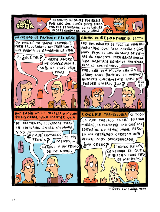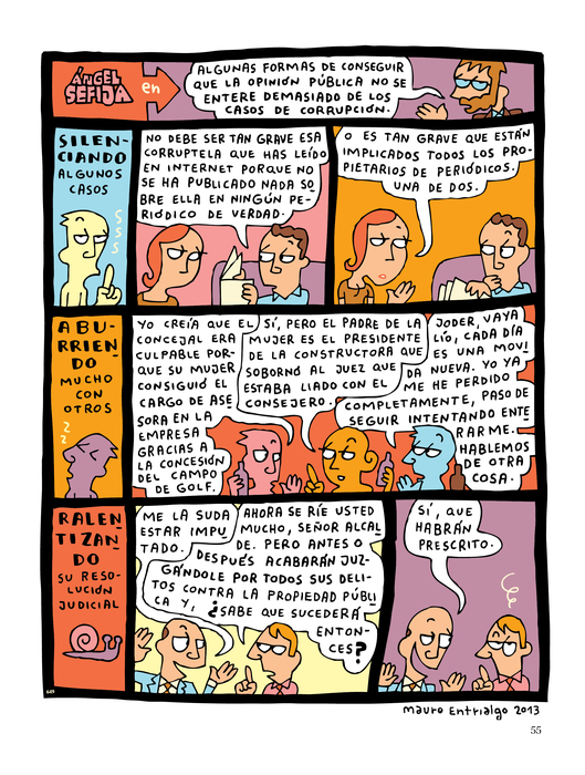 Sefija es el archivista de lo cotidiano, un hombre de mediana edad, con gafas y barba, escritor frustrado y gran observador que diserta con humor, ironía y desarmante lógica sobre los más variados temas que se le ponen a tiro en el día a día. El 6 de septiembre de 2015 se cumplen 15 años desde que Ángel Sefija protagonizara la primera plancha con serie propia en la ###cabecera de la revista satírica El Jueves. Y para celebrar la efeméride se publica Ángel Sefija tras el Noveno Arte, el noveno álbum recopilatorio de la serie. La periodista Adriana Herreros subraya que Entrialgo es “un explorador diario de lo social que se ha autoimpuesto la ingente tarea de observar continuadamente su/nuestra huella en el mundo y así documentar experiencias. Para luego, tamizado todo por su natural humor norteño y perspicacia mucha, contárnoslo”. El personaje que más ha dibujado hasta la fecha le sirve al autor vasco para “la comparación, la hipérbole, el juego de palabras, la contradicción o la desviación del discurso; agudeza verbal y mucha ironía para tratar de describir y explicar el comportamiento humano en un tiempo muy concreto. El ahora”.