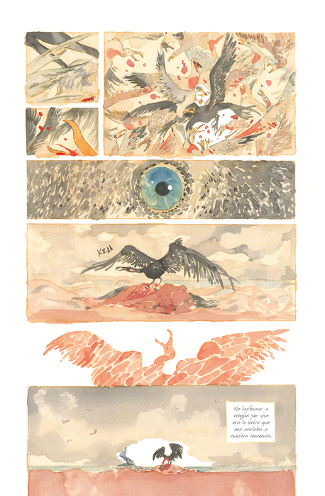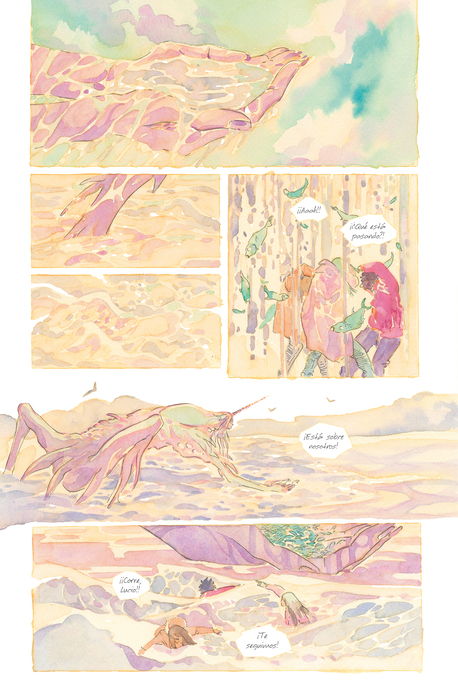 A través de unas virtuosas acuarelas cuyos colores transitan entre el amanecer y el atardecer, Emma Ríos lleva al lector a la orilla del mar para observar una historia de eco-horror postapocalíptico en la que la belleza y lo extraño se entrelazan. Los cuerpos de sus protagonistas, que se van diluyendo como la luz de la acuarela, van perdiendo su forma humana, a la vez que perdura una humanidad empática como única respuesta a una sociedad despojada de futuro.