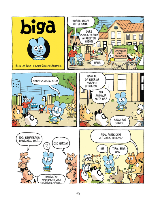 Eskolara berriz! “Animalia” lehen hezkuntzako eskolak zabalik ditu ateak bere ikasleentzat lehen eskola-egunean eta Bigak bere lekua bilatzen du ikaskideen artean. Ikasturte berriaren ohiko hasiera dirudi, baina Bigak hasiera-hasieratik txunditu ditu ikasleak. Ez du bere ikaskide txikien batere antzik. Ez da haiek bezalakoa: ez hartza, ez txoria, ez dortoka. Eta zer esan haren botere eta ahalmen ikaragarriez, haiei esker bihurtu baita Biga eskolako patioko izarra, eta bide batez gorengo maila kendu baitio Leoi kameleoiari? Biga "benetan identifikatu gabeko animalia" da, eta txundituta uzten ditu denak, hunkituta eta liluratuta haren fantasiaz eta berezitasunaz. Eta, azken batean, adiskide handi bat besterik ez balitz? Heroi txiki berri bat, jatorra eta atsegina.