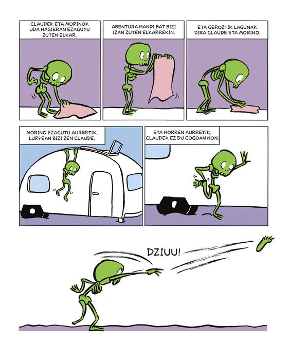 Morino zezenaren urtebetetzea da, eta auskalo zer prestatu duen Claude eskeletoak lagunaren eguna ospatzeko. Ez da ohiko ospakizun bat izango, hori seguru. Meriendatxo bat hondartzan, agian? Edo beste bidaia bat karabanan? Zaila da aurretik jakitea, zeren Clauderen oina arrain txiki baten ahoan desagertu, arrain handiago batek arrain txikia jan, eta arrantza-ontzi batek arrain handia harrapatuko baitu. Nola edo hala, oin hori topatu beharra dago! Bi lagunek hondartza nudista bat zeharkatu behar badute Kapetonera heltzeko edo Purrustegi sorginaren erratzetako armairura sartu behar badute, hala egingo dute, eta gerorako utziko urtebetetze tarta.