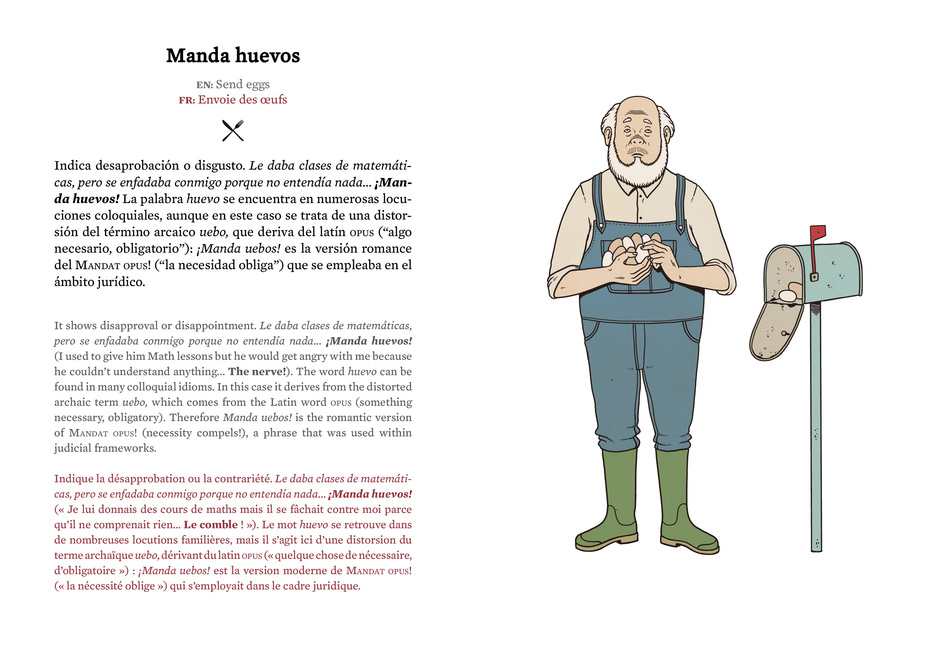 Los textos de Con dos huevos están traducidos al inglés y al francés. Un glosario ilustrado dirigido tanto a los nativos que sienten curiosidad por las expresiones más surrealistas de su propio idioma, como a los extranjeros en apuros frente a tan prolífica jerga.