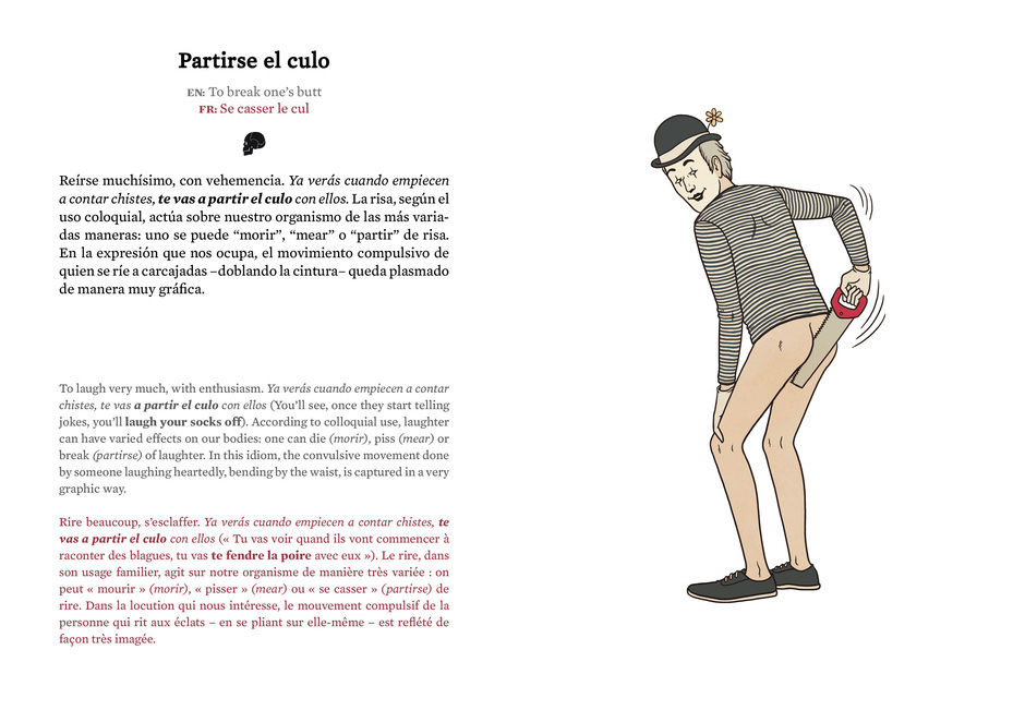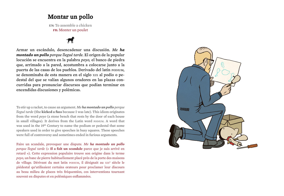 Guerrier y Sánchez empuñan bisturí y lápices para desmontar, desmenuzar y recrear las locuciones más sorprendentes del idioma de Cervantes y enseñar su faceta más desconcertante. Lo primero, gráficamente: cada expresión viene ilustrada de manera literal. Además, indagan en el origen del lenguaje. Cada expresión es descuartizada a conciencia, en un intento de descifrar su etimología, su cómo y su porqué.