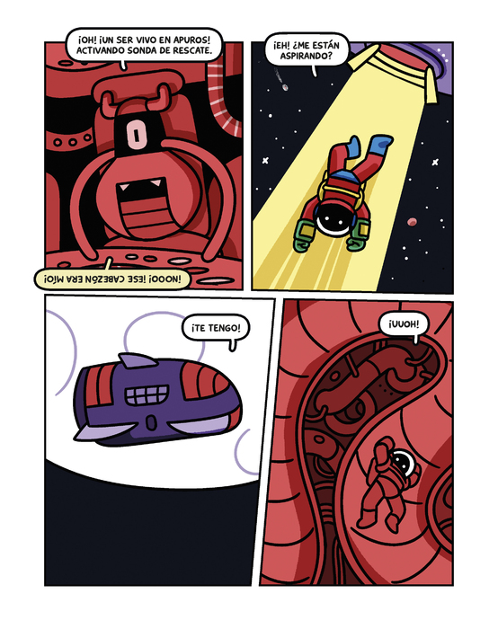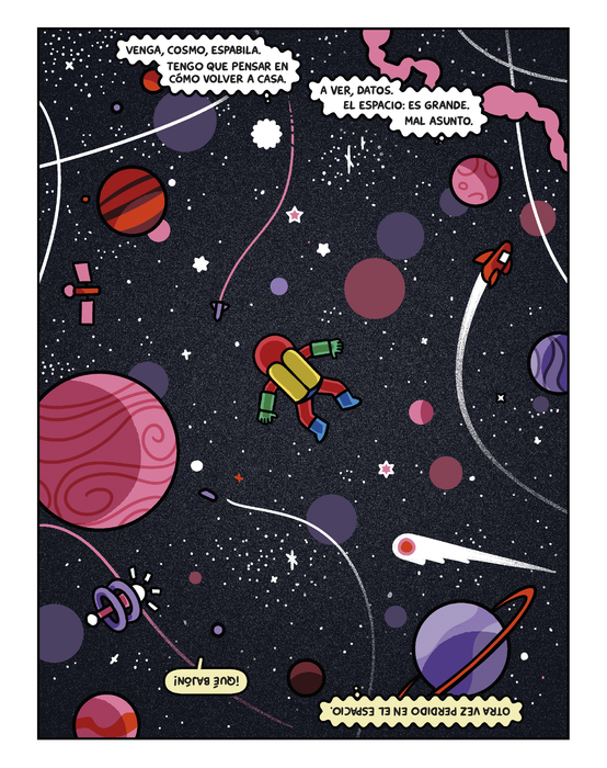 A Javi de Castro le gustan los desafíos narrativos. Después de su webcómic The Eyes, que le valió una nominación a los premios Eisner y a los Harvey 2020, su participación como ilustrador en Crímenes ilustrados, un juego online que acabó convertido en libro y su novela gráfica de “folk horror” Villanueva (Astiberri, 2021), ahora escribe y dibuja un cómic infantil que se puede y debe leer dos veces: primero del derecho y luego del revés. La aventura de Cosmo no se termina con la última de las 64 páginas de este libro, sigue al darle la vuelta. Una experiencia de lectura extraordinaria.