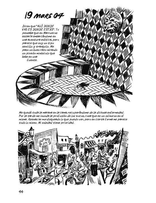 “Éste no es el ‘nuevo Craig Thompson’, sino más bien una obra secundaria y autocomplaciente. Un sencillo diario de mi viaje por Europa y Marruecos, del 5 de marzo al 14 de mayo del 2004”, explica el autor de Blankets en la introducción. Siguiendo el ejemplo de otros autores de cómic que han plasmado en un libro sus experiencias viajeras, Thompson nos regala su mirada de viajero frágil y melancólico trufada de bocetos, apuntes y comentarios de su actividad diaria durante su viaje de París a Barcelona, pasando por Marruecos y Suiza.