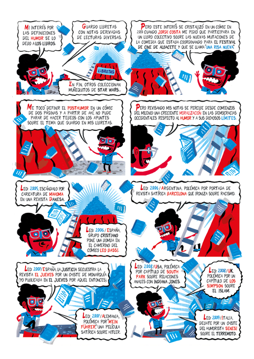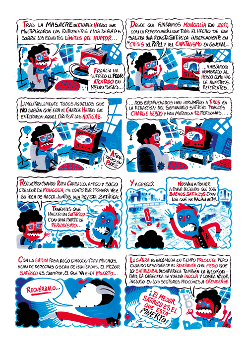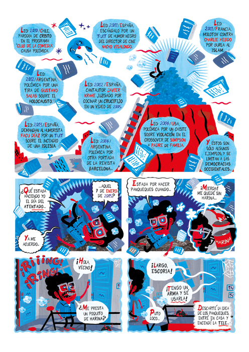 Adanti denuncia en este ensayo gráfico que estamos en una sociedad donde el cerco al humor se cierra cada vez más, no sólo desde el poder, sino también desde el ámbito moral, y que tanto los sectores conservadores como los más progresistas tienden a censurar, silenciar, y en definitiva disparar al humorista, para evitar que su voz escueza, cuando el humor precisamente consiste, en palabras del autor, “en sacar a la luz nuestros miedos, nuestros pensamientos oscuros, nuestras crueldades y debilidades; es exorcismo de nuestros males y reflejo de lo peor de nosotros mismos”.