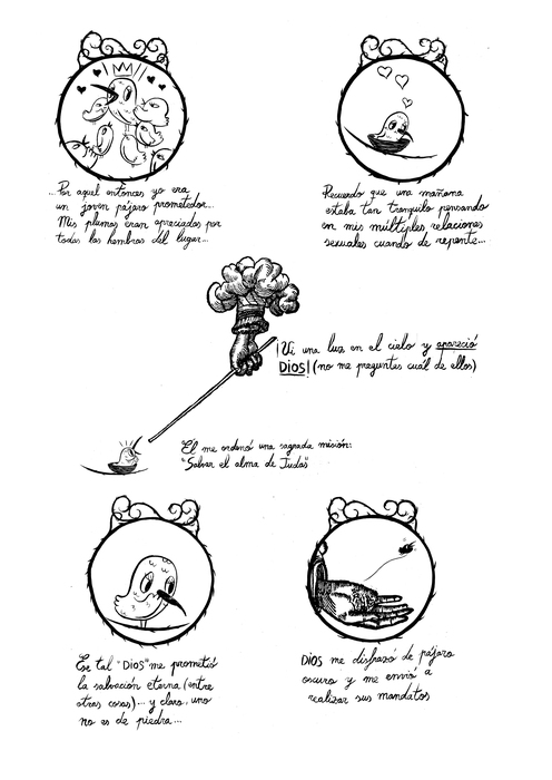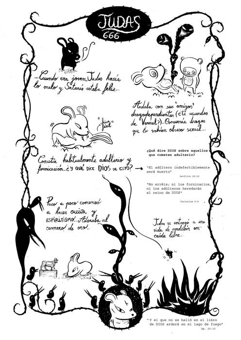 En su zigzagueante desarrollo vital (que le lleva a encontrarse con su amigo Vernel y el Gran Maestro que todo lo sabe, con Micael el pájaro fantasma y el sapo Christian, con Jesús Cristo el editor y con el Lobito, entre otros secundarios que conforman la rica galería de personajes que acompañan a Judas por mundos no menos imaginativos como el laberinto de la Falsa Felicidad, la montaña del Gran Maestro o Mimolandia), se abordan algunos de los temas que interesan al autor, como las sectas religiosas, el proceso creativo, la crítica o el mercado de las propuestas artísticas minoritarias.