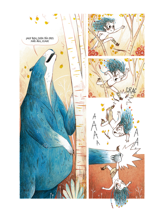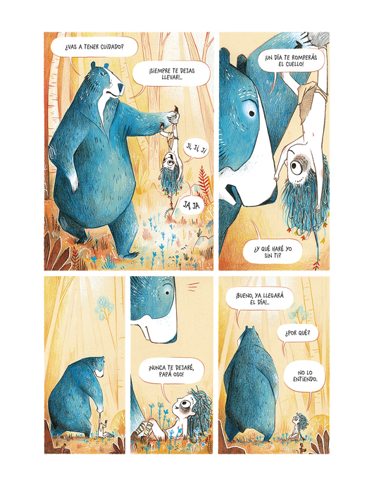 Los caracteres de los dos miembros de esta familia muy unida chocan a lo largo de un peligroso recorrido hacia el destino de Elma, recordando por momentos al maravilloso Libro de la selva. La ternura y el suspense están presentes en cada una de las páginas de esta historia de Ingrid Chabbert, creadora de un relato iniciático que aborda cuestiones como la madurez, la resiliencia y el luto. Vuelve a impactar el colorido trabajo de la talentosa Léa Mazé, autora completa de la trilogía Los Muértimer (Astiberri, 2021-2022), ganadora entre otros galardones del premio al mejor cómic infantil ACBD (Asociación de periodistas y críticos de cómic de Francia). “Me encanta su trazo y sus colores, es una auténtica maga del color. Sus dibujos tienen alma. Se nota sobre todo en la relación entre Papá Oso y Elma. Es como si fueran a salir de la página y cobrar vida. Tiene un talento fenomenal”, asegura Ingrid Chabbert sobre el arte de Léa Mazé.