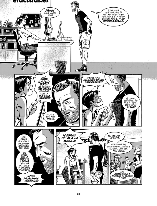 “Santiago García introduce variantes al discurso oficial y hace aflorar las miserias del país, elaborando una ficción cargada de significados y símbolos que va más allá de lo aparente. Quien quiera enterarse de qué sucede hoy en España sólo tiene que leer este magnífico tebeo”. Miguel Ángel Oeste, Rockdelux