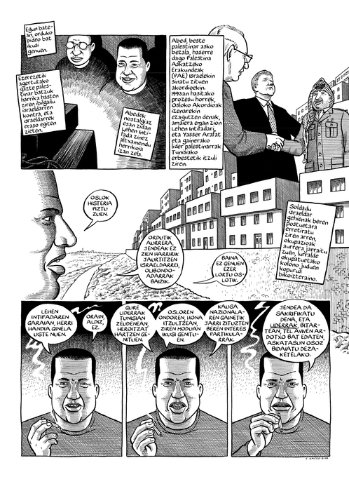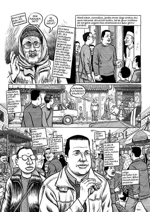 Artxiboen zokorik sakonenean, 1956ko gertakari odoltsu bat dago kukututa: soldadu israeldarrek 111 palestinar akabatu zituzten tiroz. Hilketaz jositako historia luze bateko oin-oharra dirudien arren, Rafahko egun hark –odol hotzean burututako masakrea ala akats izugarria– agerian uzten ditu konponbiderik gabeko gerra baten atzean dauden errealitate ugariak. Gertatutakoaren muinera iritsi nahian, Joe Sacco erabat murgiltzen da Rafahko eta handik gertu dagoen Khan Yunisko eguneroko bizitzan, Gazaren iragana eta oraina biluzteraino. Gazako oin-oharrak obrak berrogeita hamar urteko denbora-tartea hartzen du, bizi-bizi mugitzen da gerra batetik bestera, eta iheslarien, eskola-umeen, alargunen zein xekeen ahotsak biltzen ditu: finean, tragedia baten esentzia jasotzen du.