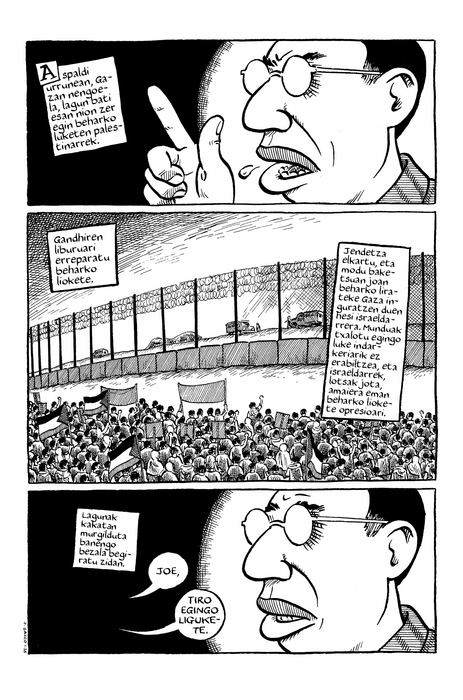 Gerra Gazan 32 orrialdeko garrasia da, gerraren indarkeriari buruzko komiki latza, demokraziaren hauskortasunaz diharduen obra. Kaosaren aurrean ezertarako ahalmenik ez duen gizon batek, Joe Saccok, paparretik heldu eta irakurketan murgiltzeko gogoa piztuko digu.
