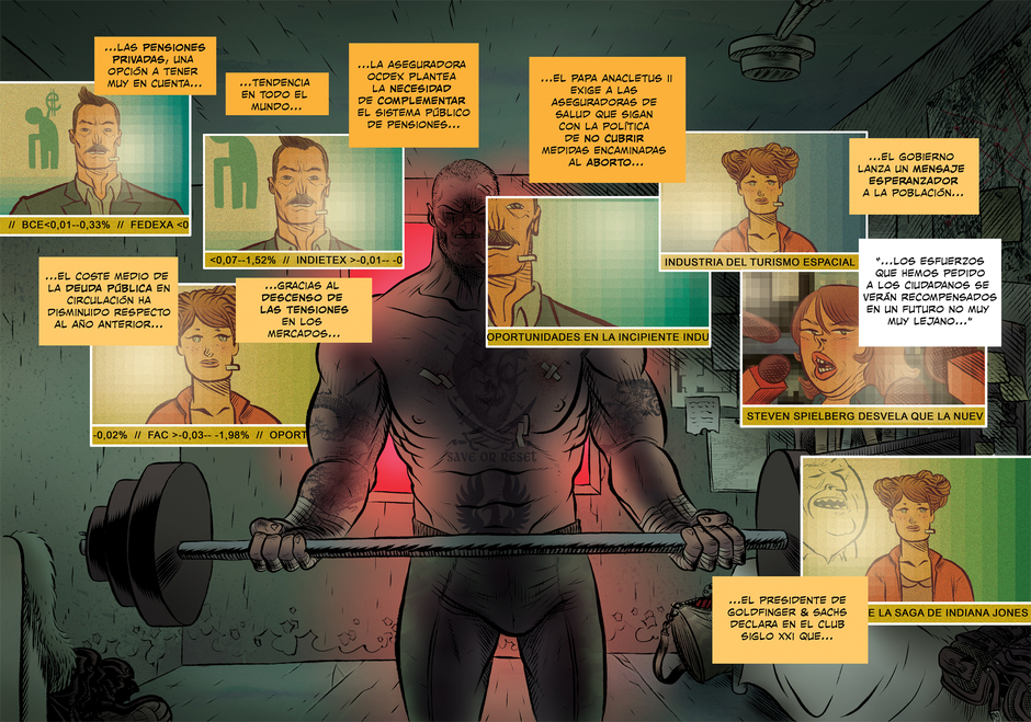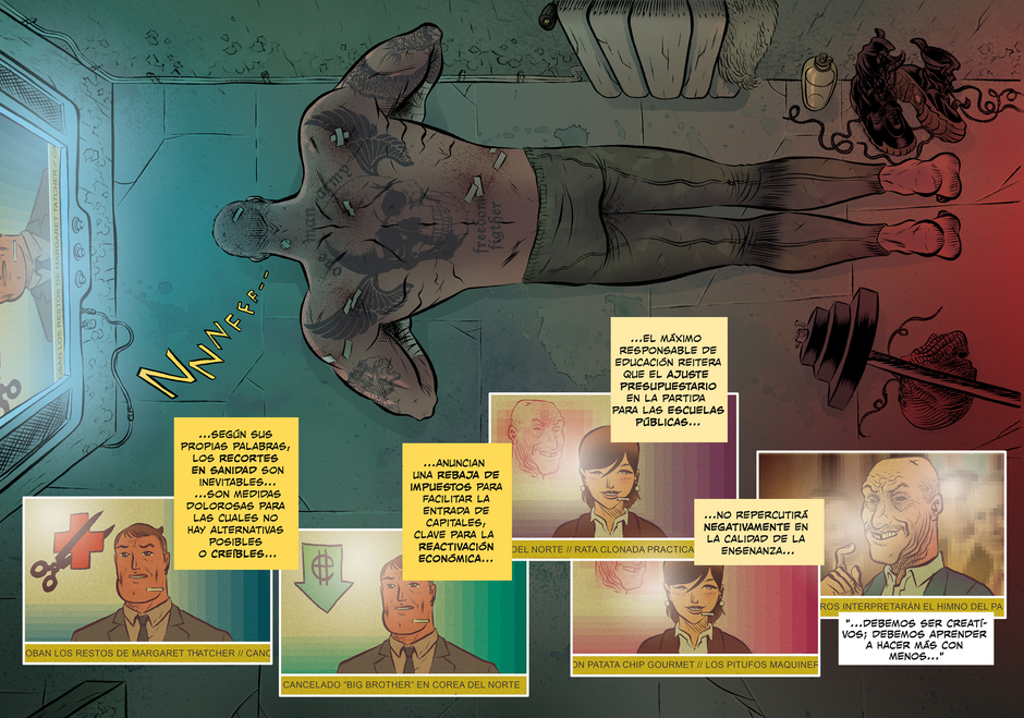 Marcos Prior (Necrópolis) y David Rubín (El héroe, Beowulf) plantean una sátira política con acción a raudales donde la reflexión, la emoción y la experimentación formal son elementos básicos sobre los que se sostiene un cómic a todas luces visceral. El gallego Rubín juega con la composición y tira de una rica paleta de colores para poner en imágenes un sugerente texto del catalán Prior, siempre inclinado a incidir sobre cuestiones sociales, políticas y vitales que le preocupan.