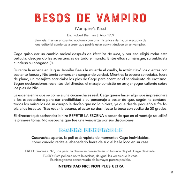 ¿Cuántas películas de Nicolas Cage has visto? Seguro que muchas más de las que te parece y muchas menos de las que deberías. Tras cuatro décadas de carrera como actor, Nicolas Cage ha construido una filmografía tan espectacular como extravagante en la que conviven obras maestras con infrapelículas demenciales, los mejores directores con los más atroces y personajes llenos de matices con caricaturas chaladas. Su mítica intensidad ha dado lugar a todo tipo de leyendas y anécdotas. ¿Es cierto que se comió una cucaracha rodando una escena? ¿Se arrancó dientes para sentir mejor el dolor? ¿Tiene su propio método interpretativo basado en conceptos chamánicos? Todas estas preguntas y muchas más son respondidas en Las 100 primeras películas de Nicolas Cage, un libro único para celebrar a un actor irrepetible.