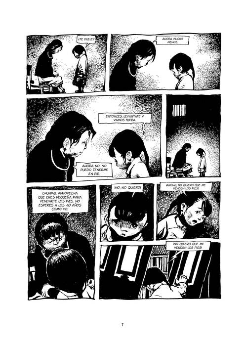 Siguiendo la costumbre tradicional, según mandan los cánones de belleza para así poder aspirar a un matrimonio que permita a las niñas subir de clase social, la joven Chunxiu es obligada a vendarse los pies para que no crezcan, con la tortura física que supone. Pero el calvario no termina ahí. Con la llegada de Mao deberá soportar la presión de una nueva sociedad que rechaza los hábitos de la China imperial. Los pies vendados constituye un curso de historia de primera mano y, al mismo tiempo, una crítica abierta a las sucesivas revoluciones vividas por China, pero también es la trágica biografía de una mujer que las sufrió.