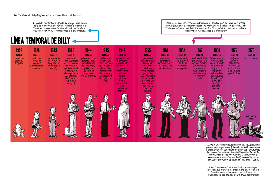 “Yo, Billy Pilgrim, moriré, siempre he muerto y siempre moriré el 13 de febrero de 1976”. Billy Pilgrim se ha desprendido en el tiempo. No puede controlar a dónde se dirige. Vive en un estado continuo de pánico escénico, porque no tiene ni la más remota idea de qué parte de su vida va a tener que representar a continuación. Billy se ha acostado siendo un viejo viudo y se ha despertado el día de su boda. Ha construido una familia cariñosa y ha presenciado el bombardeo de Dresde. Ha entrado por una puerta en 1955 y ha salido por ella en 1941. Ha vuelto a traspasar esa puerta y se ha encontrado en 1963. Ha visto su nacimiento y su muerte muchas veces, según dice, y viaja al azar hacia cualquier momento de su vida. Eso dice.