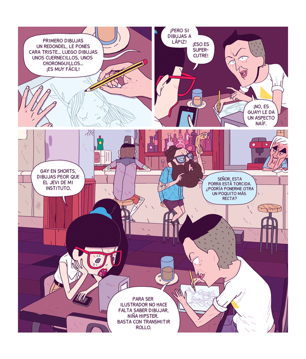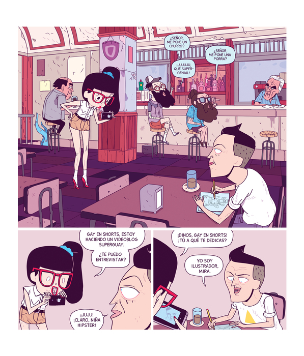 No me pegues que llevo gafas es una fábula hipster, un sueño húmedo de modernos de provincias, un viaje desde el brunch al gintonic premium. Expos en espacios llenos de propuestas, bares trendy, cool, cozy, con sillas de cocina de abuela y blogueras bebiendo en tarritos. Barbas homogéneas, camisas ###estampadas, moños. Todo muy craft, muy DIY. Un must, en resumen.