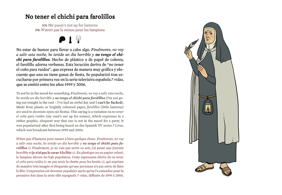 Los textos de No tengo el chichi para farolillos están traducidos al inglés y al francés. La definición de cada locución viene traducida a ambos idiomas, ya que el lector foráneo –expatriado, turista o estudiante del idioma cervantino– se topa a menudo con esas expresiones hechas, esos modismos o giros idiomáticos que pueden dejarle perplejo. Y con el propósito de resaltar esa sensación de extrañeza en el descubrimiento de un idioma, haciendo eco a las ilustraciones en un juego de espejos, cada expresión también viene traducida de manera literal: to shit on someone’s teeth (cagarse en las muelas de alguien), to go to another neighbourhood (irse al otro barrio), to give the crouton (dar el tostón) ...