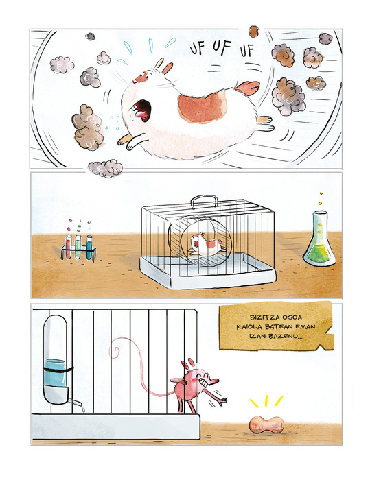 Pin, Pan eta Pun satitsu bat, laborategiko sagu bat eta hamster bat dira, eta sartuta dauden kaioletatik ateratzea dute desirarik handiena. Giltzapetuta bizi izan dira beti, eta denbora horretan ezohiko gaitasunen bat garatu dute. Huts egindako saio batzuen ondoren, kanpoko mundura heltzea lortuko dute. Behin kanpoan, ordea, gauzak ez dira haiek espero bezala gertatuko, eta zailtasunak bata bestearen atzetik azalduko zaizkie. Pin, Pan eta Pun lehen irakurleentzako abentura atsegin eta dibertigarri honetan, gainera, animalia espezie horiei buruzko zenbait bitxikeria ikasiko ditugu. Album ilustratuen hizkerara hurbiltzen den komiki bat da, elkarrizketarik gabekoa, narratzailearena baita kontakizunaren ahots bakarra, eta hala, akuarela teknika mistoarekin landutako orrialde goxoak azalduko dizkigu.