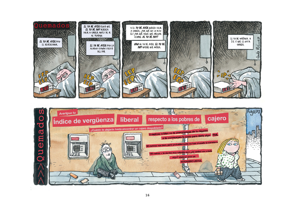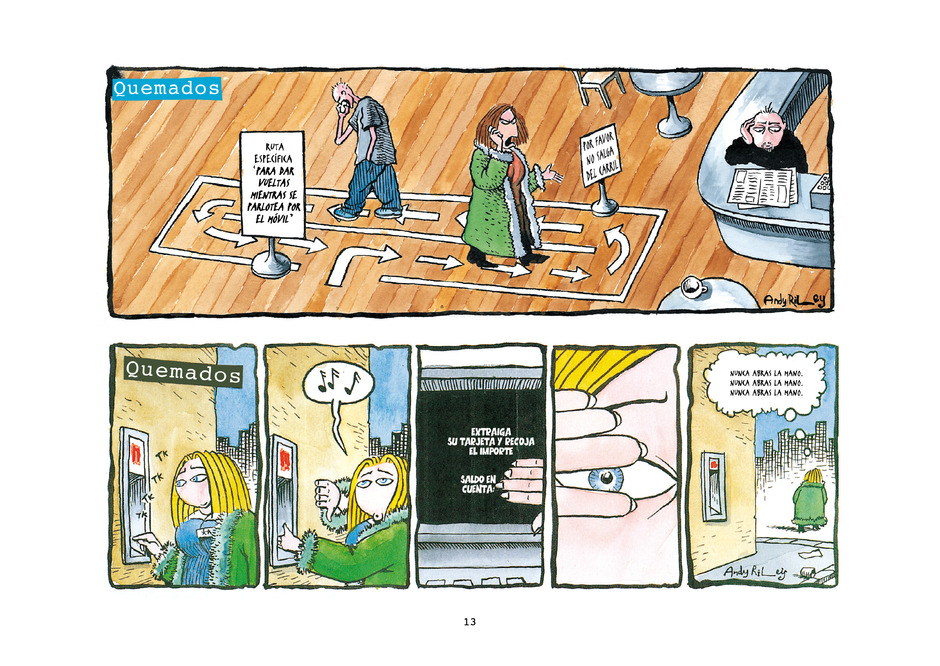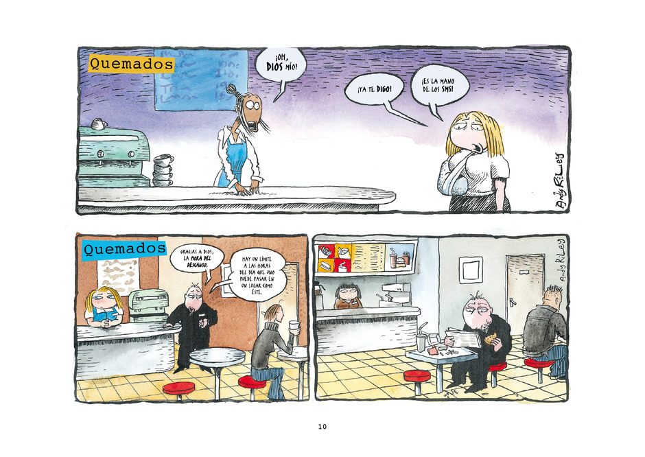 Tres camareros en una cafetería: el treintañero decaído, la glotona enamoradiza, el bobalicón tocapelotas. Aburridos, hastiados, quemados, no les queda más remedio que pasarse el día observando a la gente y sus manías, pero también sus propios ombligos. Andy Riley hace brotar de esta miseria laboral y vital situaciones de lo más jocosas y, sobre todo, verdades como puños.