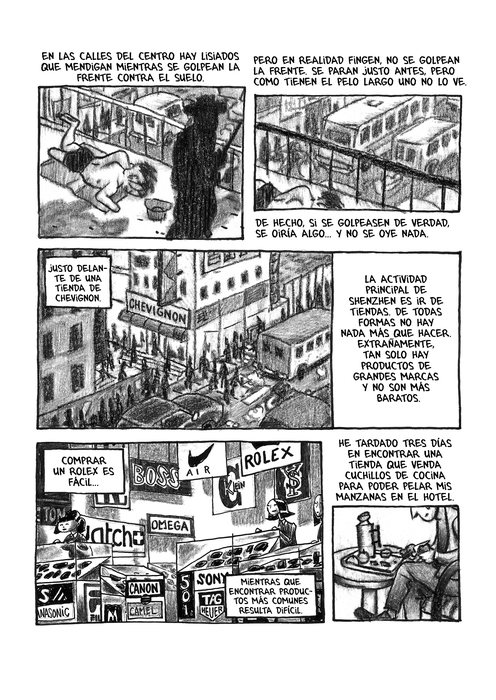 Shenzhen, ciudad elegida por Deng Xiao Ping como campo de pruebas de la llamada “economía socialista de mercado”, ha pasado de los 30.000 habitantes que tenía en 1980 a 10 millones en la actualidad, y se ha convertido en una de las ciudades más dinámicas de China y una de las megalópolis del mundo. Durante un mes, Guy Delisle, autor de Pyongyang, ejerció en Shenzhen como director de un equipo de dibujantes en la realización de un proyecto de animación.