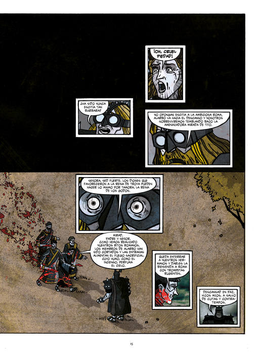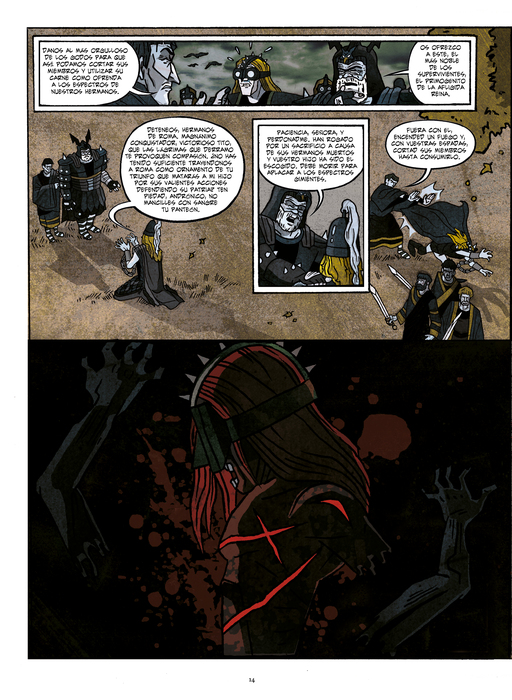 El Tito Andrónico de Prior y Rico es una adaptación –“traición” apuntan sus autores, en su respetuosa y documentada traslación al cómic– de la tragedia homónima, generalmente fechada entre 1592 y 1594, años en los cuales se prohibieron las representaciones teatrales en Londres cuando las muertes semanales a causa de la peste superaban la cifra de 30. “Conjuras, presagios, fatalidad, los desastres de la guerra... Si la tragedia se define en su naturaleza inexorable –asegura el escritor y crítico, Rubén Lardín–, esta adaptación del clásico lo hace en su oportuna vibración entre la mascarada black metal y el retablo ultragore. Un tebeo salteado de arrebatos extáticos que en su apreciación política nos remite a la realidad siempre inmoderada, al contubernio que rige nuestra organización social aquí y ahora, y que no olvida señalarnos como responsables de nuestra propia calamidad”.