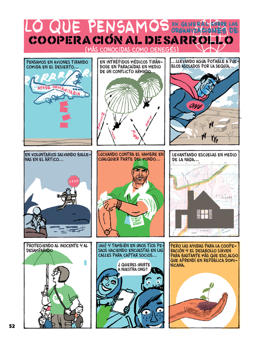 Historias que fueron llenando sus cuadernos de viaje con rostros, nombres y relatos tan reales como emocionantes. Todos estos apuntes sirvieron para dar forma a cada uno de los cómics que contiene este libro. Un recorrido en viñetas por esa otra parte del mundo –Colombia, Marruecos, Nicaragua, República Dominicana, Filipinas, Mauritania y Burundi– que confirma que la cooperación al desarrollo funciona, cambia y salva vidas.