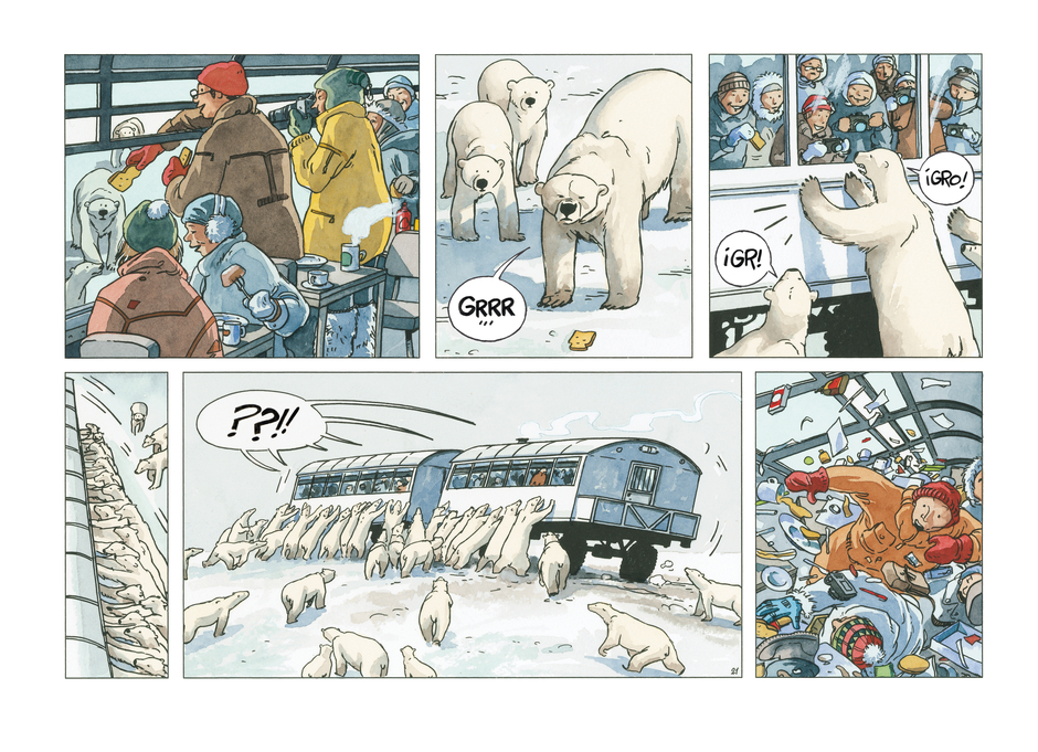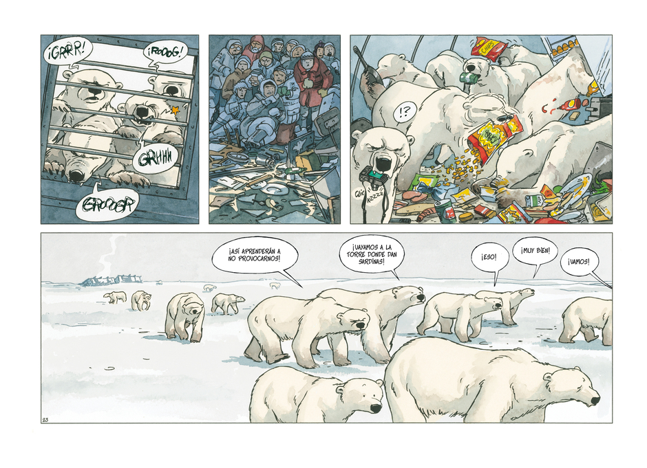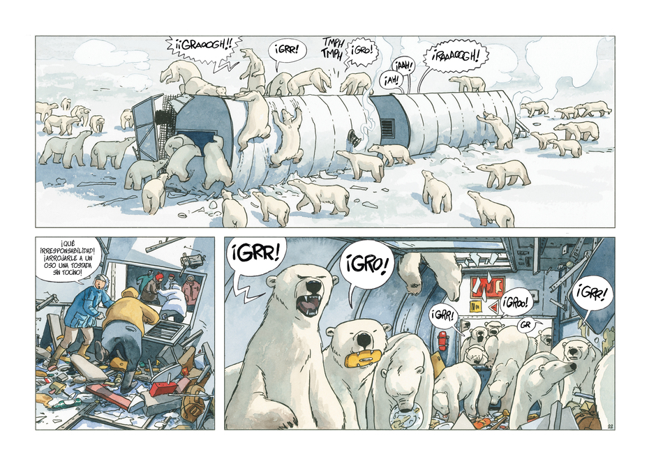 Para Ana Miralles ha sido un verdadero reto gráfico dotar a los osos de expresiones y rasgos humanos. Las bromas sobre lo fácil que sería hacer una historia de osos polares en el Ártico se rompieron en pedazos al ver los colores que se iban desplegando en su paleta. El resultado es un sorprendente mundo multicolor que amplía la gama de ciertos lugares paradigmáticos como la siempre verde selva tropical.