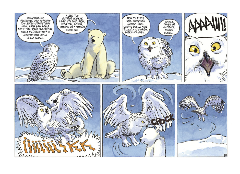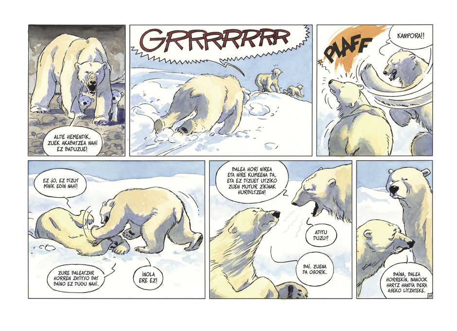 “Emiliok bikain erabiltzen ditu hitzak –gehitzen du Teresa Valerok–. Haren elkarrizketa naturalistek, umore eta samurtasunez mukuru, sinesgarri egiten dituzte hartzek bizi dituzten egoera zenbaitetan ahaztezinak. Anak, bere aldetik, inuitek aipatzen dituzten elurraren kolore guztiak ezagutzen ditu. Eta gai da hartz bakoitzari nortasun bakana emateko, zeregin handiei aurre egiten dieten izakiek baino ez daukaten adierazkortasun sendo eta sakonaz apaintzeko”.