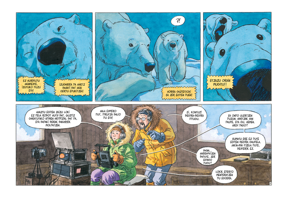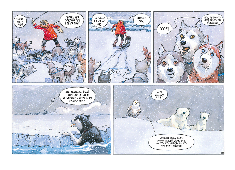 Emilio Ruizen eta Ana Mirallesen Waluk 3. Txakur Handiaren bidea lan honetan, protagonistek, Walukek eta Eskimok agur esan diete Valkiari eta bere kumeei, eta bidaian aurrera egin dute, izarrek gidaturik. Laster konturatuko dira eremu mortu haiek ez direla uste bezain bakartiak eta izaki bitxiak bizi direla bertan; esterako, Loki, izaki xelebre eta oso adimentsu bat, herrestan, hegan eta jauzi egiten badakiena eta bere burua sutsuki babesten duena. Eta, jakina, han dira gizakiak ere, hartzentzat guztiz beldurgarriak diren izaki ahul, hozbera eta arriskutsu horiek, zapata parea egiteko hartzei larrua kentzeko gauza diren horiek, euren txakur fidelekin leretatik tiraka. Baina baliteke Artikoan gauzak hain begi bistakoak ez izatea, irudikeriak guztiz ohikoak baitira han. Baliteke hartzek eta txakurrek gauza asko izatea komunean. Baliteke lagun onak izatea eta are elkar maitatzea ere. Eta baliteke txakurren patua Waluk eta Eskimo hartz azkar eta ausarten esku egotea, Uhuapeu hontza, inguru haietan inoiz ibili den hontz jakintsu eta zentzudunena lagun dutela.